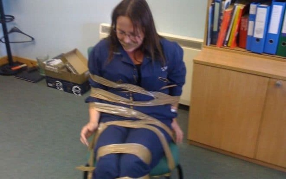 The fisheries officer has taken her case to an employment tribunal and claims she was taped up as a warning to keep quiet.